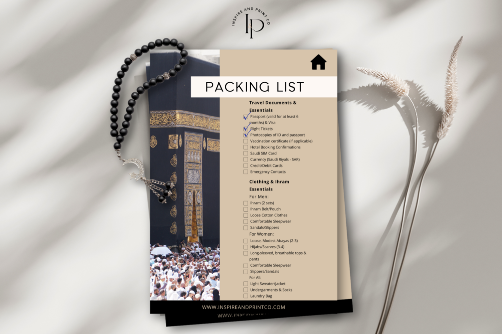 • Never forget essentials like travel documents, Ihram, or health items.