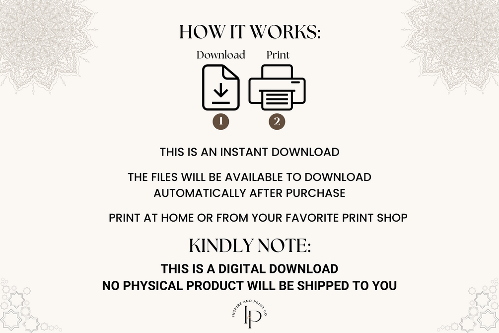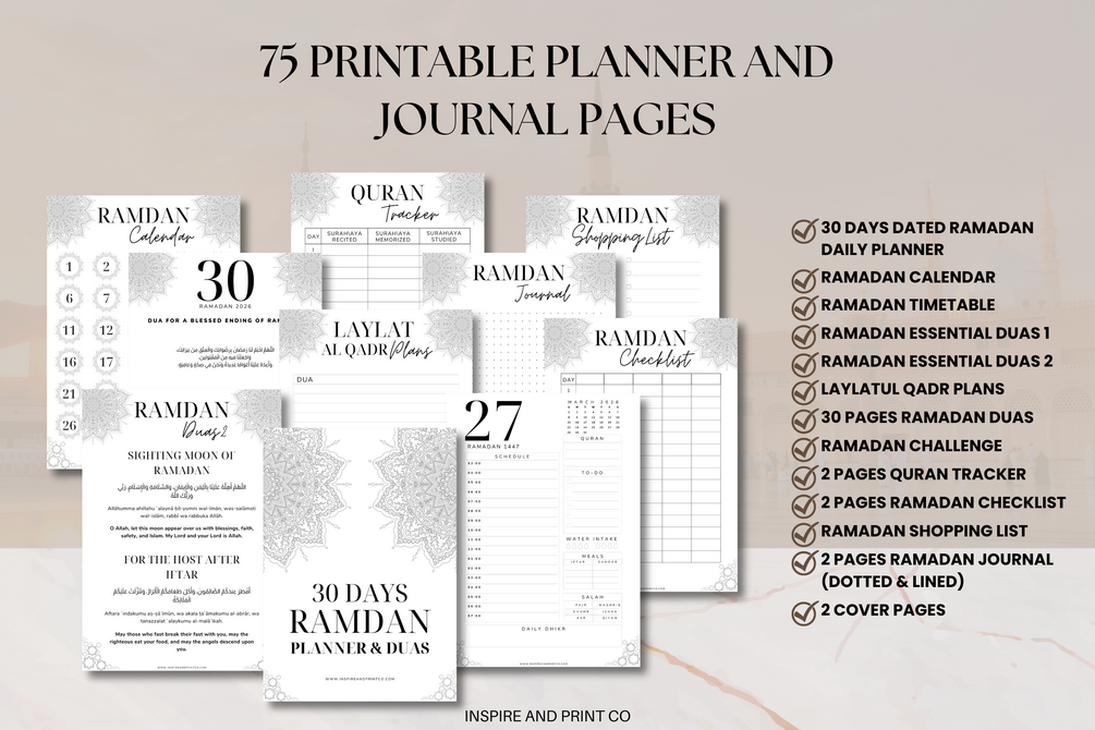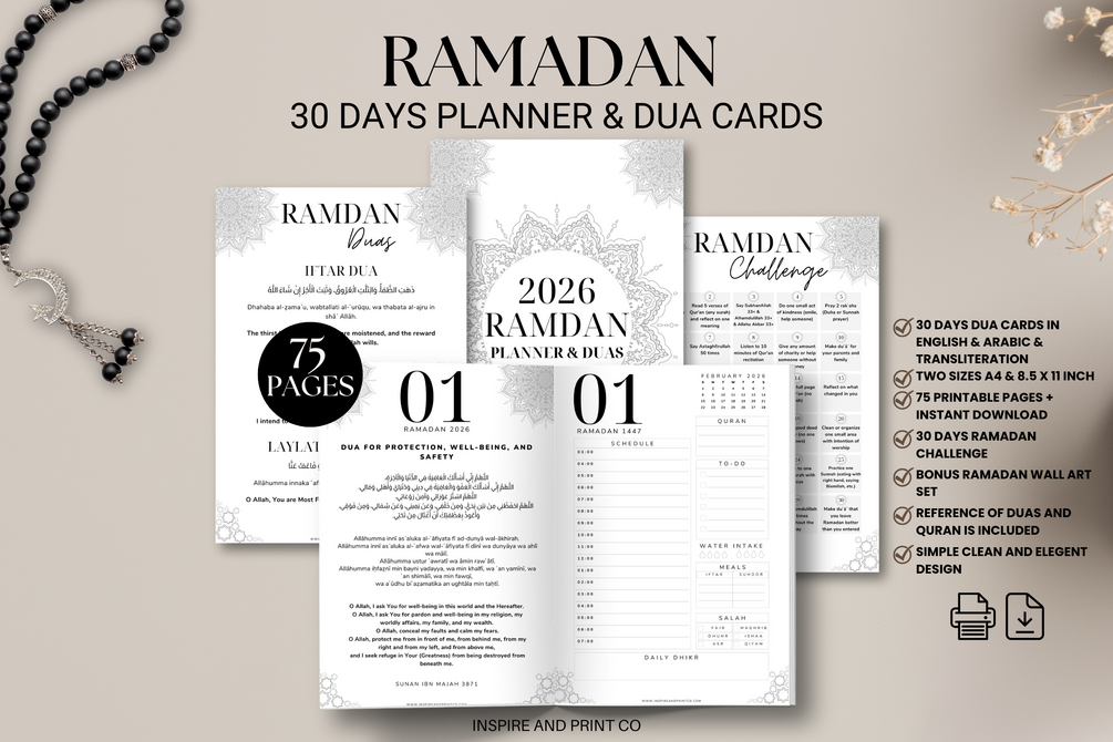This is a 3 in 1 product (Planner, Duas, & Wall Art) thoughtfully created to support your Ibadah while keeping your Ramadan organized and intentional.