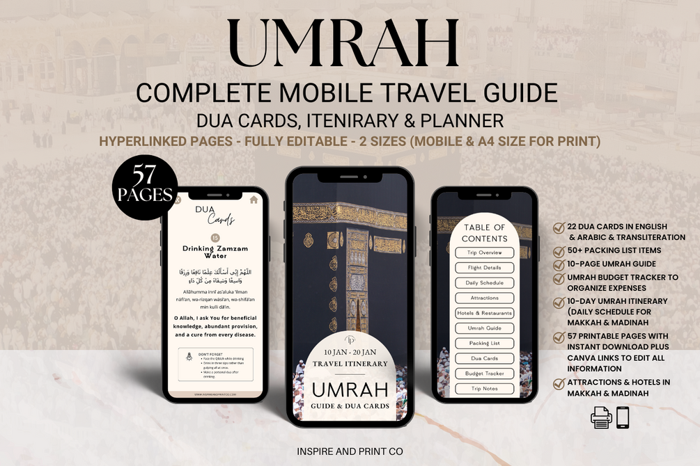 Whether you are a first-time pilgrim or returning, this digital planner supports every step of Umrah, from preparation to completion.