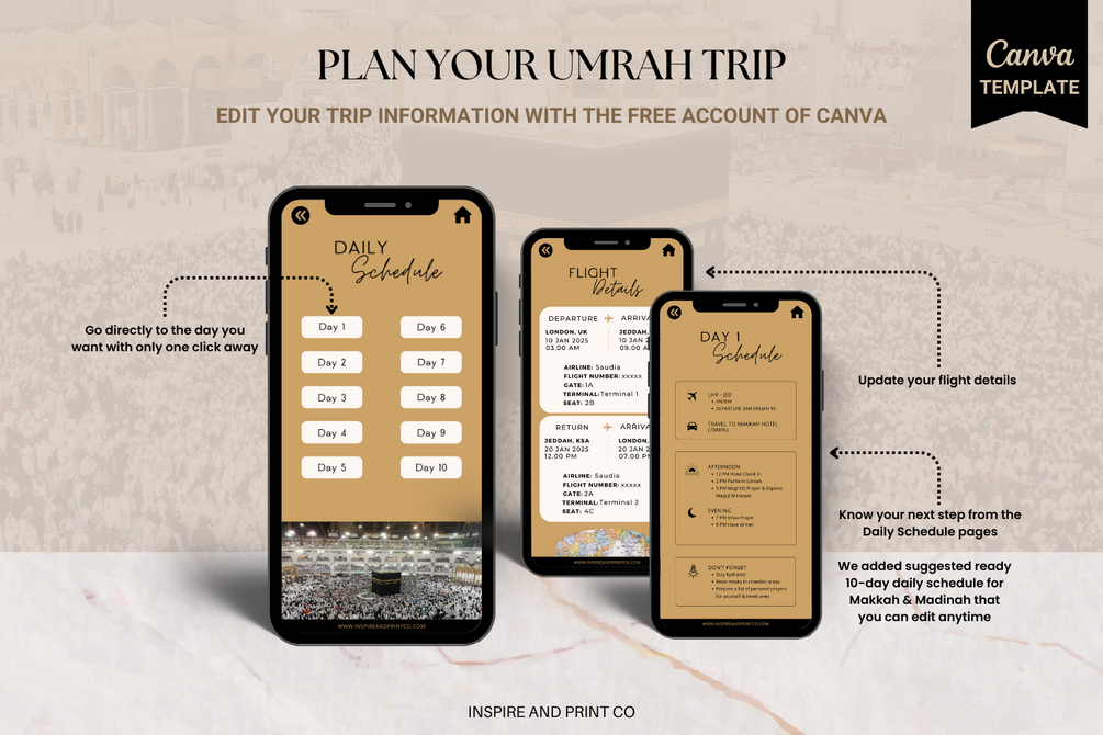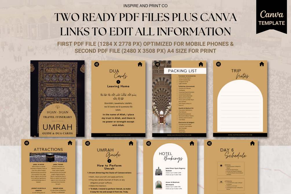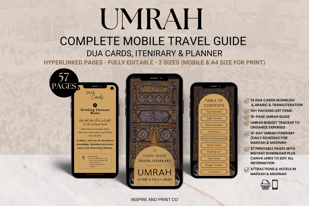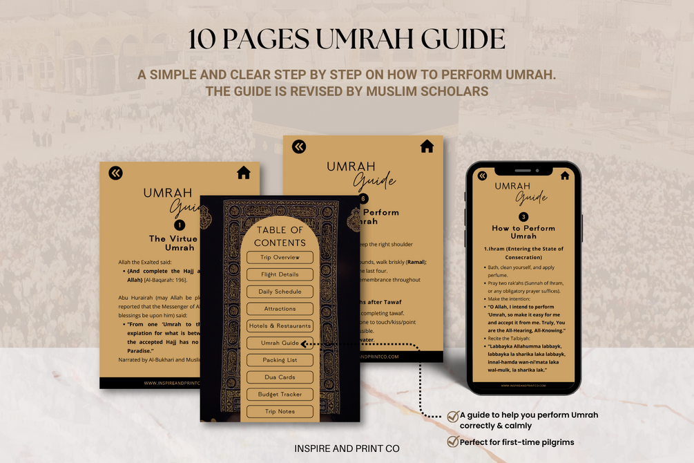 Whether you are a first-time pilgrim or returning, this digital planner supports every step of Umrah, from preparation to completion.
